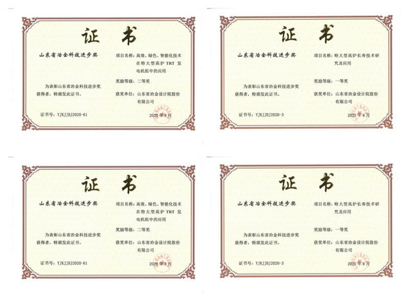 日前,山東省冶金工業(yè)總公司公布2020年度山東省冶金科技進步獎獲獎項目,其中我公司申報的《特大型高爐長壽技術研究及應用》、《大型燒結機節(jié)能環(huán)保綜合技術研究與應用》、《鋼管混凝土格構柱+主次桁架屋蓋重型冶金廠房體系研究與應用》3個項目榮獲一等獎,《高效、綠色、智能化技術在特大型高爐TRT 發(fā)電機組中的應用》榮獲二等獎。