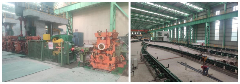 龍騰特鋼高速端板法蘭生產(chǎn)線是國內(nèi)采用全連軋工藝生產(chǎn)的高速端板法蘭軋鋼生產(chǎn)線,產(chǎn)品涵蓋國內(nèi)外端板法蘭的絕大部分規(guī)格要求。通過雙蓄熱步進(jìn)式加熱爐加熱后,鋼坯進(jìn)入11臺(tái)平立交替布置的高剛度短應(yīng)力線軋機(jī),實(shí)現(xiàn)全連續(xù)無扭軋制。通過我院專利設(shè)備浮動(dòng)式夾送輥和平立轉(zhuǎn)換裝置,不同規(guī)格的端板法蘭扁鋼可在軋制完成后實(shí)現(xiàn)快速平轉(zhuǎn)立,并通過轉(zhuǎn)轍器及卷前輥道分別輸送至6臺(tái)卷取機(jī)進(jìn)行卷取。生產(chǎn)線配備先進(jìn)的自動(dòng)控制系統(tǒng),對全線物流進(jìn)行跟蹤,實(shí)現(xiàn)工藝過程的自動(dòng)化。先進(jìn)的設(shè)備與合理的工藝流程,大大提高了生產(chǎn)線的生產(chǎn)效率和成材率,預(yù)計(jì)年產(chǎn)量可達(dá)50萬噸。