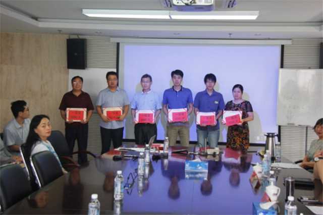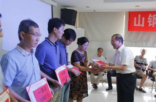 公司董事長(zhǎng)魏新民、總經(jīng)理衣忠德給一等獎(jiǎng)?wù)撐淖髡哳C發(fā)榮譽(yù)證書及獎(jiǎng)勵(lì)。