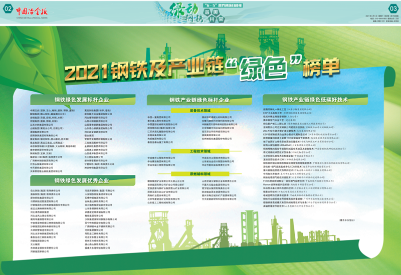 近期中國冶金報公布了2021年度中國鋼鐵品牌企業(yè)和2021年度鋼鐵及產(chǎn)業(yè)鏈“綠色”標(biāo)桿企業(yè),我公司雙雙上榜。5月10日,第5個中國品牌日,公布了2021中國鋼鐵品牌榜單,公司再次榮獲中國鋼鐵工程技術(shù)類“優(yōu)秀品牌供應(yīng)商”榮譽稱號,我公司已經(jīng)連續(xù)兩年獲得中國鋼鐵工程技術(shù)類優(yōu)秀品牌企業(yè)。6月5日,世界環(huán)境日,公布了2021鋼鐵及產(chǎn)業(yè)鏈“綠色”榜單,公司榮獲中國“鋼鐵產(chǎn)業(yè)鏈綠色標(biāo)桿企業(yè)”稱號。