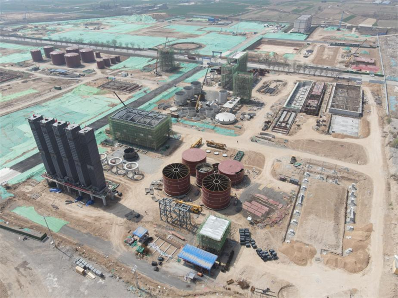 煤氣凈化區(qū)域的鼓風(fēng)機(jī)站、蒸氨框架、脫氨廠房土建結(jié)構(gòu)已經(jīng)封頂,循環(huán)水泵房以及集水池已經(jīng)完成澆筑,油庫(kù)區(qū)、焦油氨水分離區(qū)域的罐體逐步封頂,初冷器設(shè)備安裝完成,脫硫、終冷洗苯以及電捕等主要設(shè)備的安裝以及埋地管道的施工已在進(jìn)行中。