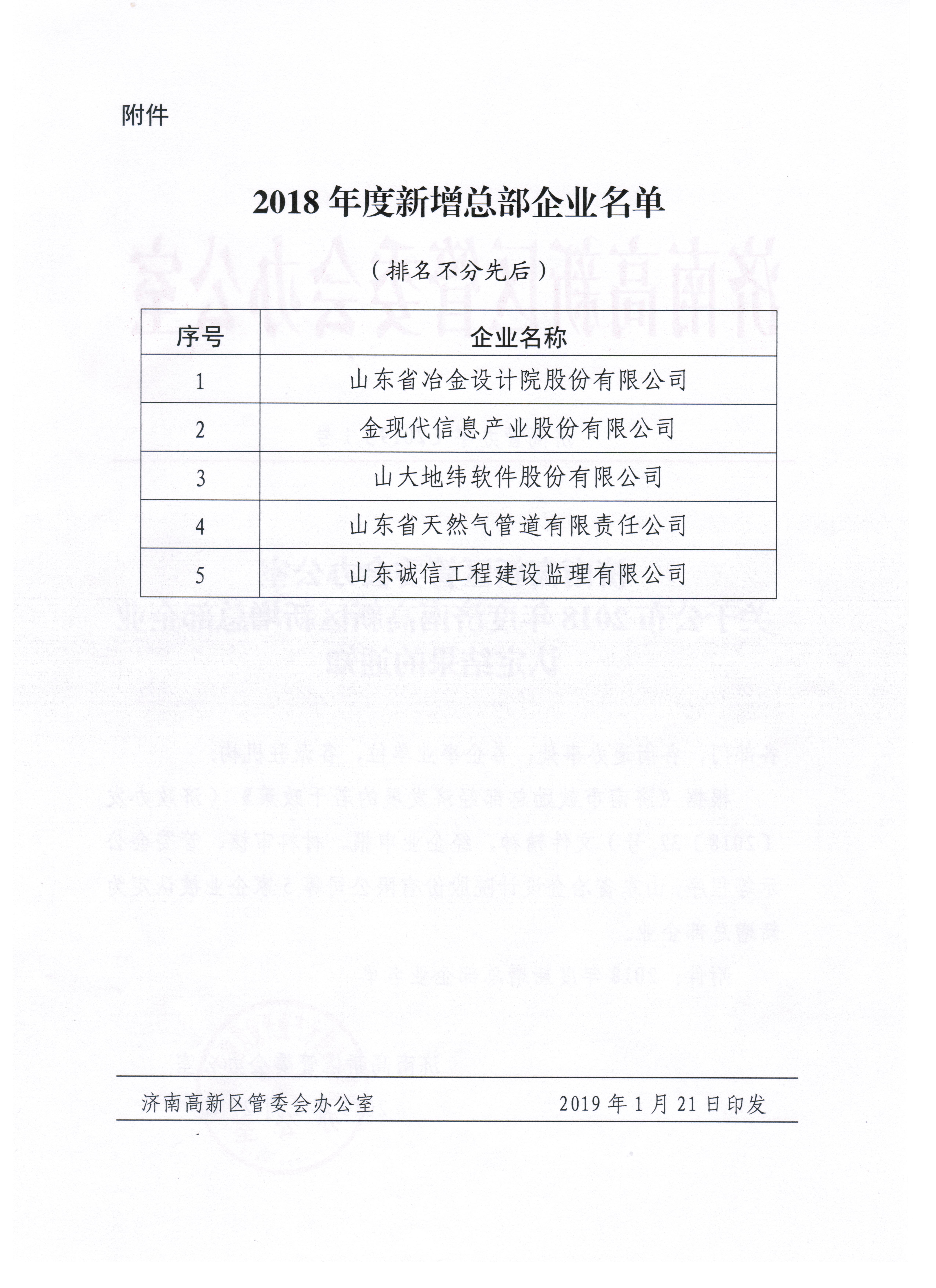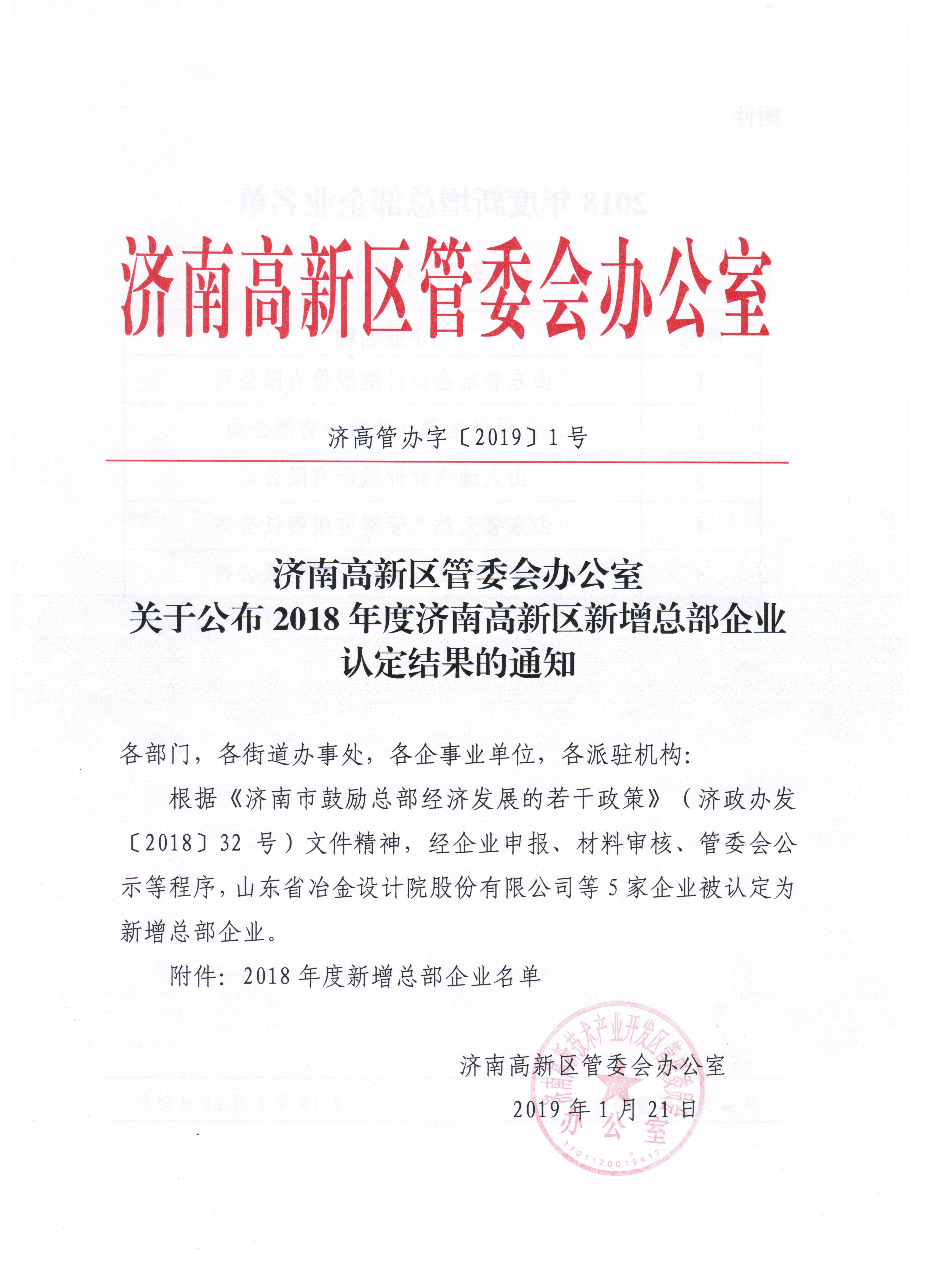 近日,山東省冶金設計院股份有限公司被濟南市認定為首批“總部企業(yè)”。這標志著我公司的綜合實力以及對地方發(fā)展的貢獻得到了濟南市政府的高度認可。