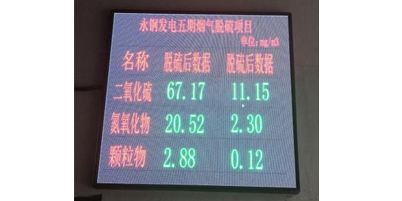 公司EPC總承包的聯(lián)峰鋼鐵有限公司電力廠5#煙氣脫硫項目自投運以來,通過對鍋爐煙氣脫硫前后參數(shù)的采集與對比,對脫硫劑小蘇打的噴吹量實現(xiàn)自動調(diào)節(jié),經(jīng)過一個月的調(diào)試,除塵器出口煙氣含塵顆粒物、SO2,氮氧化物的含量均低于國家超低排放行業(yè)標(biāo)準(zhǔn),達到公司承諾運行保證值,滿足性能考核要求。脫硫后的排放數(shù)據(jù)實時顯示到大屏,對外公布。