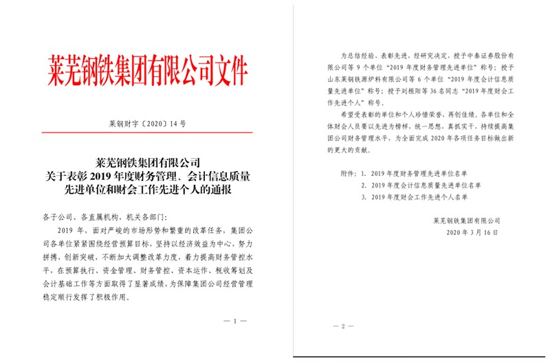 2020年3月16日,萊鋼集團下發(fā)“關(guān)于表彰2019年度財務(wù)管理、會計信息質(zhì)量先進單位和財會工作先進個人的通報”,山冶設(shè)計榮獲“2019年度財務(wù)管理先進單位”稱號,創(chuàng)研公司榮獲“2019年度會計信息質(zhì)量先進單位”稱號,山冶設(shè)計財務(wù)部萬同輝、創(chuàng)研公司財務(wù)部薛云榮獲“2019年度財會工作先進個人”稱號。