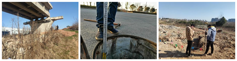本次現(xiàn)場實測數(shù)據(jù)包含現(xiàn)狀鐵路橋橋墩坐標、橋梁凈空,已建設道路交叉口坐標及高程,已施工雨、污水井坐標及井深等,測量項目涉及到“陽邏之心”50多萬平方米二十余條道路,測量范圍廣闊,測量目標眾多,而測量人員僅為王學皓、吳修業(yè)及二十冶測量技術員陳工,實測任務異常艱巨?,F(xiàn)場多為半施工或未施工道路,測量情況十分復雜,并同時遭遇武漢強降溫天氣,踏勘工作面臨極大考驗。尤其在雨污水井數(shù)據(jù)測量方面,部分道路車流量較大,需搭設臨時圍擋保證測量安全;部分重型井蓋受重載車輛碾壓密實變形,現(xiàn)有工具簡陋,僅打開井蓋這一項往往需要數(shù)十分鐘,完成單個井數(shù)據(jù)測量至少需要一個多小時,遠遠超出預估時間。與時間節(jié)點競速,測量人員踏霜踩露而出,披星戴月而歸,歷經(jīng)四天全力以赴、克難攻堅,圓滿完成所有測量任務,為設計工作順利進行提供了有力的數(shù)據(jù)支持。