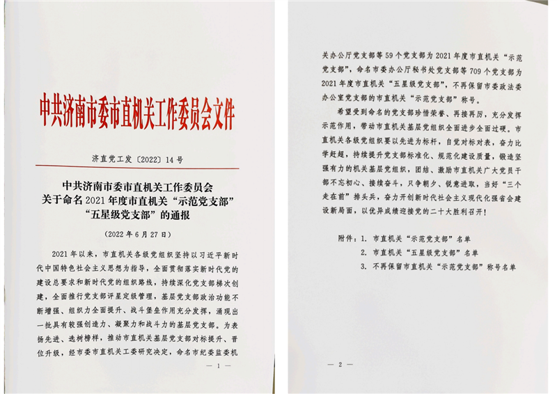 市委市直機關(guān)工委印發(fā)的《關(guān)于命名2021年度市直機關(guān)“示范黨支部”、“五星級黨支部”的通報》(濟直黨工發(fā)〔2022〕1號文)中,授予我單位熱風(fēng)爐工程技術(shù)分公司黨支部、焦化事業(yè)部黨支部、耀華能源公司黨支部、土建設(shè)計一部黨支部、土建設(shè)計二部黨支部、職能管理第一黨支部、公司辦公室黨支部、電氣設(shè)計部黨支部、經(jīng)營管理黨支部、職能管理第二黨支部共10個黨支部為“五星級黨支部”。獲獎支部將繼續(xù)發(fā)揮示范作用,團結(jié)激勵支部黨員,不忘初心、勇于擔(dān)當(dāng),努力為公司發(fā)展做出更大貢獻。